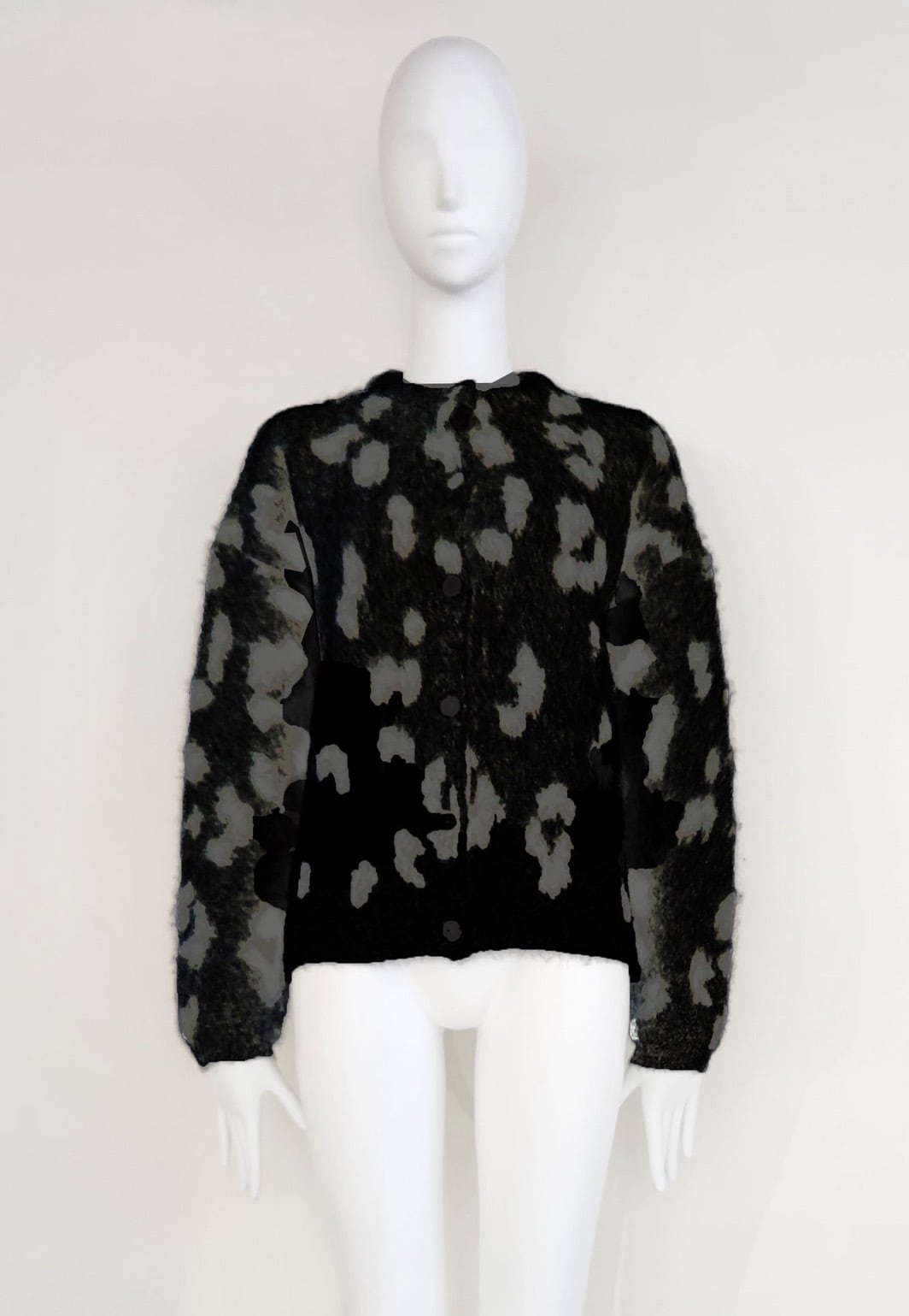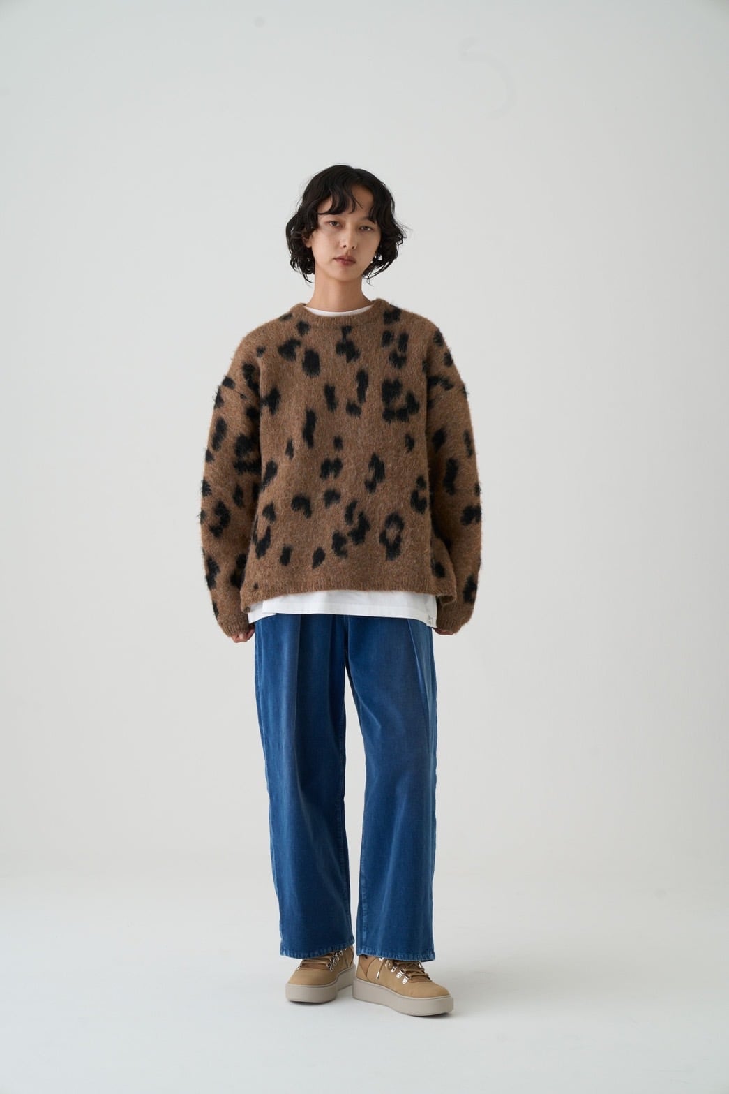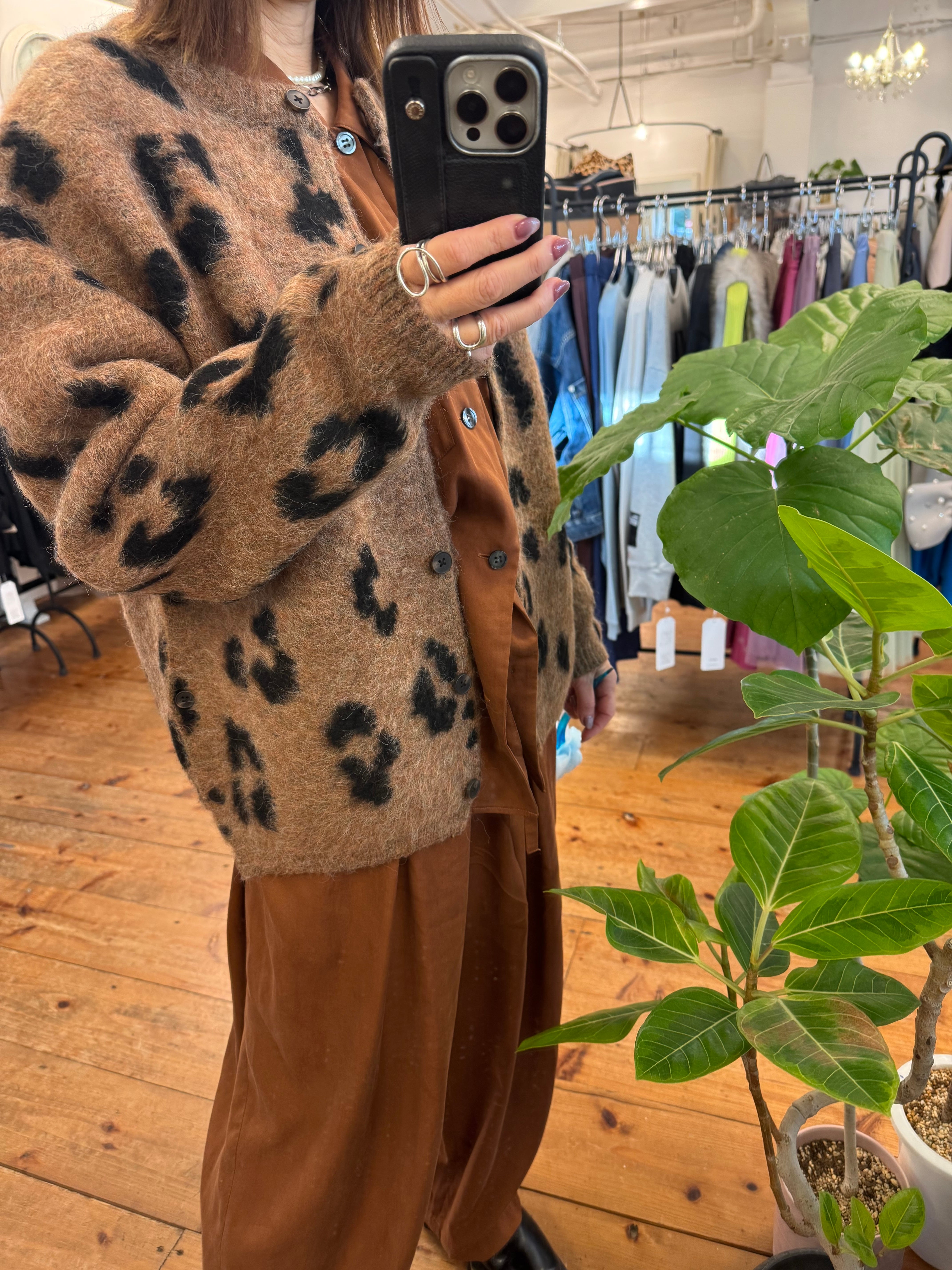 アクリル混の糸を5ゲージのチーター柄ダブルジャガードで編み上げた存在感あるニット素材。シャギーならではのふんわりとした毛足のある柔らかな風合いと、大人っぽい単色チーター柄が特徴的です。