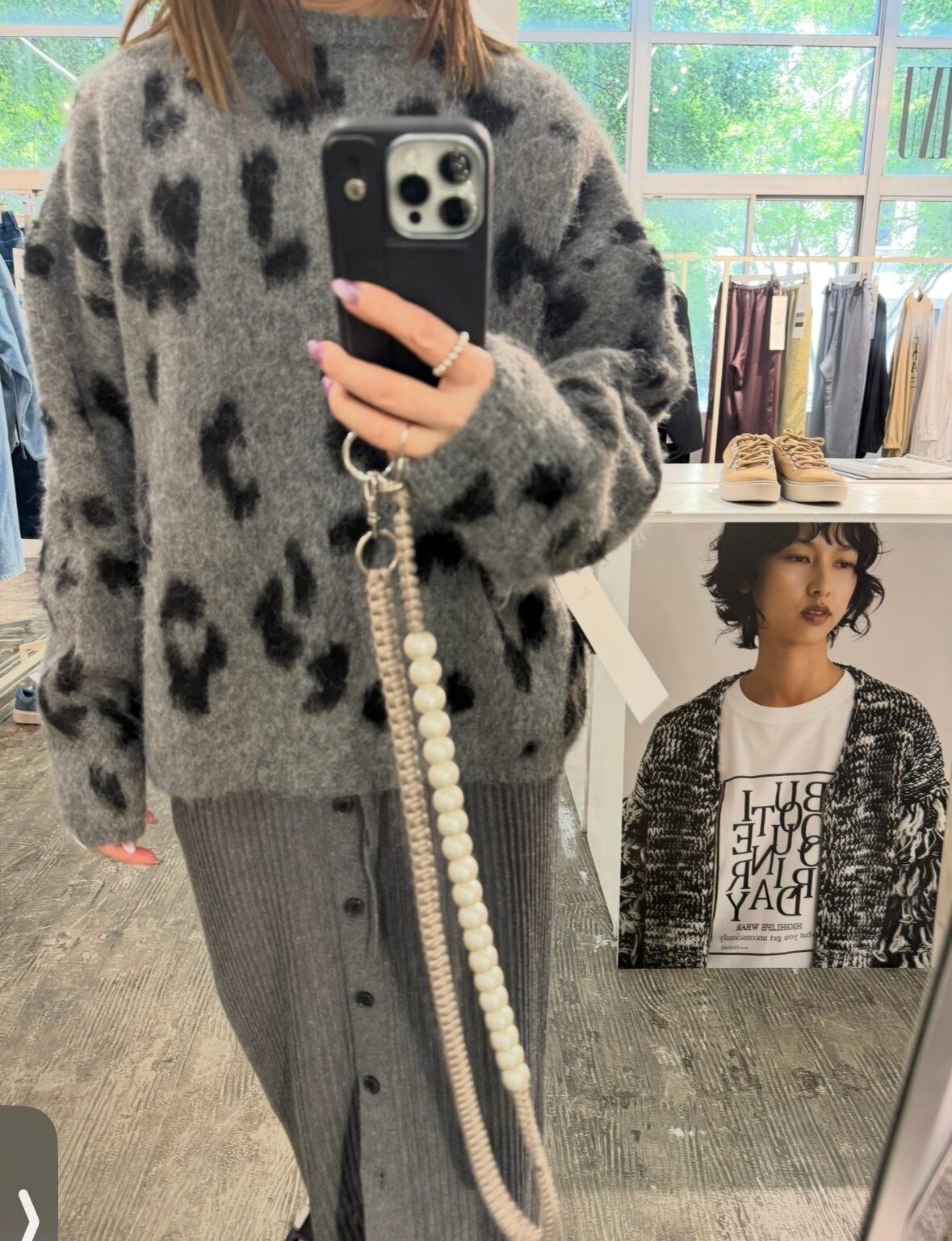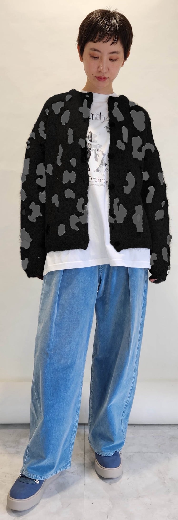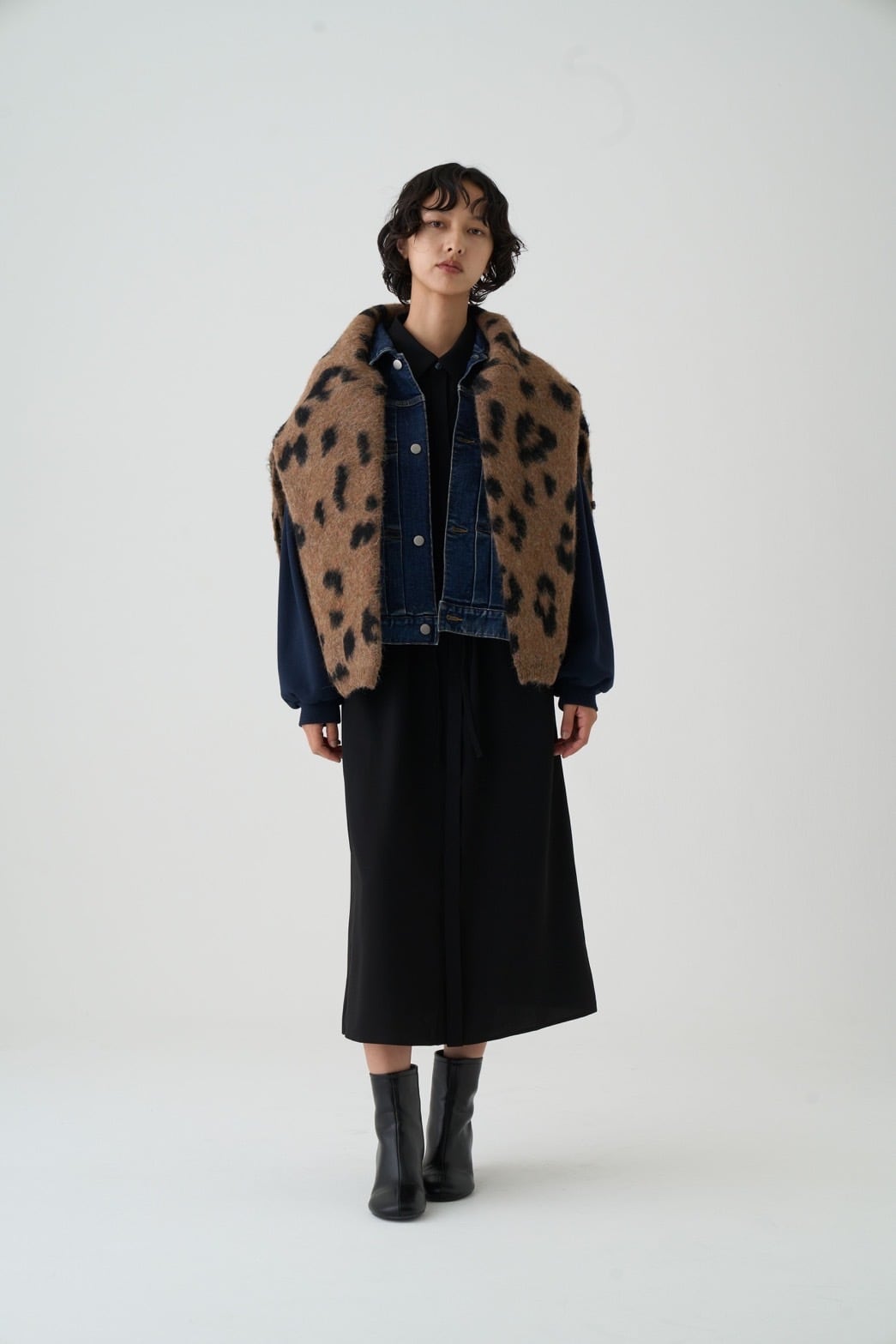 アクリル混の糸を5ゲージのチーター柄ダブルジャガードで編み上げた存在感あるニット素材。シャギーならではのふんわりとした毛足のある柔らかな風合いと、大人っぽい単色チーター柄が特徴的です。